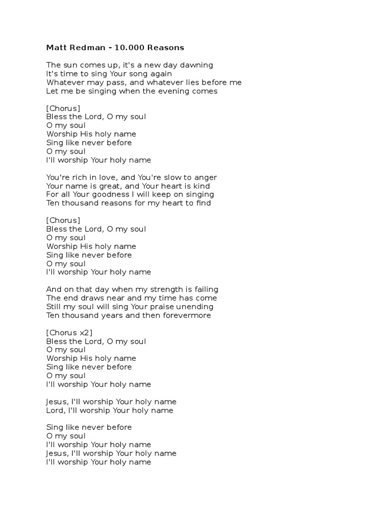 Lyric 10000 Reasons. Bless the Lord O my soul O my soul Worship His Holy name Sing like never before O my soul I'll worship Your Holy name. You're rich in love And You're slow to anger Your name is great And Your heart is kind For all Your goodness I will keep on singing Ten thousand reasons For my heart to find.